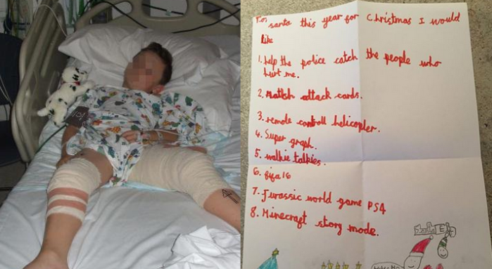 A seven-year-old boy who was shot in the leg in Salford has written a letter to Santa asking him to help find the people…