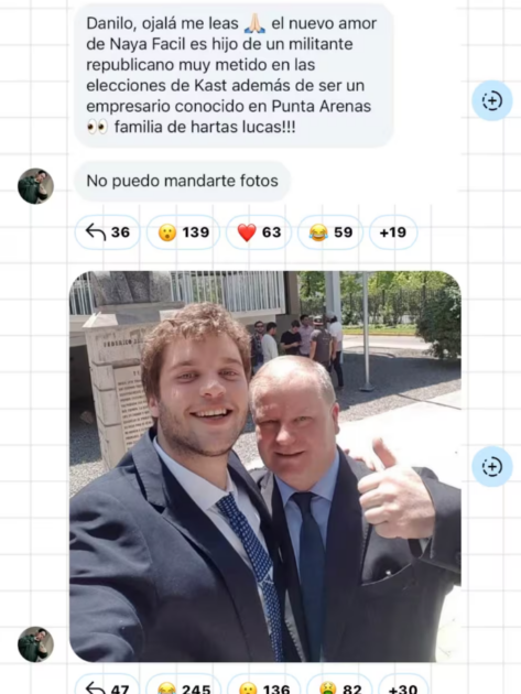 “El nuevo amor de Naya Fácil es hijo de un militante republicano muy metido en las elecciones de Kast, además de ser un empresario conocido en Punta Arenas. ¡Familia de hartas lucas!”, filtraron en dicho medio, adjuntando una foto.