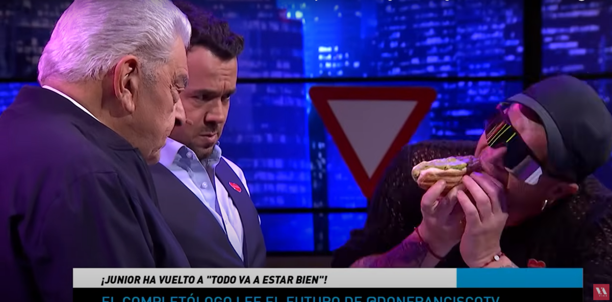 Tras este saludo, Junior Playboy pasó a “leer la mordida de completo” a Don Francisco. Para ello, miró al animador y luego le dio una mordida a la comida.