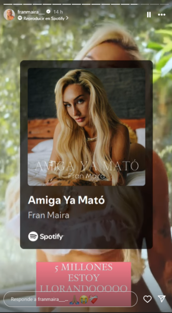 Cabe señalar que, por estos días, Fran Maira estrenó su nueva canción No te necesito, y celebra los más de 5 millones de reproducciones de su hit Amiga, ya mató. “¡Estoy llorando!”, expresó por este logro.