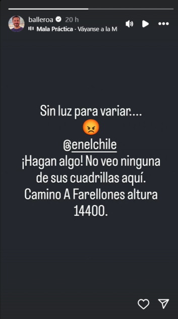 En esta línea, Álvaro Ballero usó sus redes sociales para descargar su enojo tras pasar varias horas sin luz en camino a Farellones, zona ubicada en Lo Barnechea.