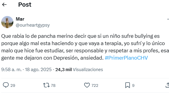 “Es como el niñito del que todos se burlan. Algo hay en ese niño, que tiene una carencia (…) Uno nunca es víctima, siempre es responsable”, expresó Merino en pantalla, desatando duras críticas en redes sociales.