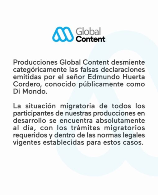 Ante las afirmaciones públicas realizadas por Di Mondo, Megamedia consideró necesario aclarar los hechos y precisar la normativa migratoria aplicable.