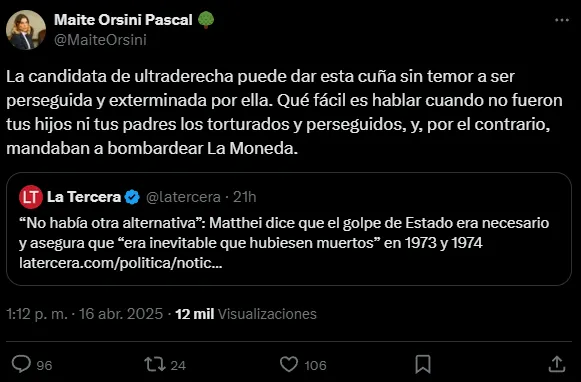 Maite Orsini critica a Evelyn Matthei por justificar la dictadura de Pinochet, quien calificó los crímenes de lesa humanidad como "inevitables". Matthei afirmó en una entrevista que el Golpe Militar de 1973 era necesario y que las muertes eran inevitables en un inicio. Sus declaraciones generaron polémica en el oficialismo, siendo condenadas por el Presidente Gabriel Boric y la diputada Orsini, quien la cuestionó por su vínculo familiar con la dictadura. Orsini reprochó a Matthei por hablar sin haber sufrido personalmente las consecuencias de la represión del régimen de Pinochet.
