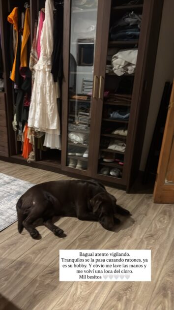 Finalmente, la periodista mostró a su perrito vigilando la zona y aseguró: “Bagual atento vigilando. Tranquilos, se la pasa cazando ratones, ya es su hobby y obvio, me lavé las manos y me volví una loca del cloro. Mil besitos”.
