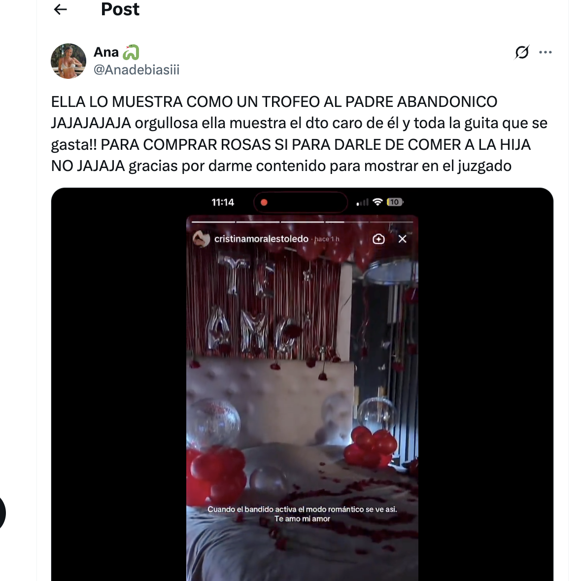 “Esto pone la actual de mi ex. Claro, porque a ella el ex le dejó 5 millones de dólares. Dice que la gente feliz no jode, ¡cuando el novio no quiere hacerse cargo de la hija! Dios, con qué tupé, hermana, te comés a un vago que no quiere ni a la hija”.