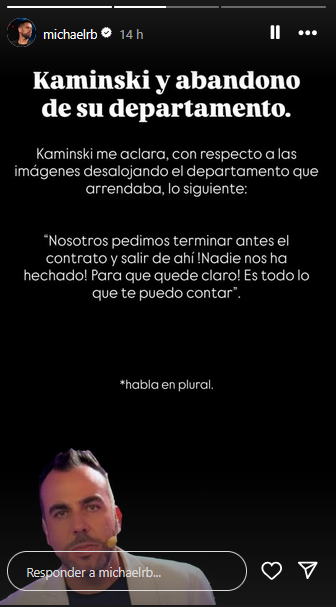 En ese contexto, el comunicador explicó lo ocurrido con el periodista Michael Roldán. “Kaminski me aclara, con respecto a las imágenes desalojando el departamento que arrendaba, lo siguiente”, expresó el comunicador, publicando el mensaje que recibió.