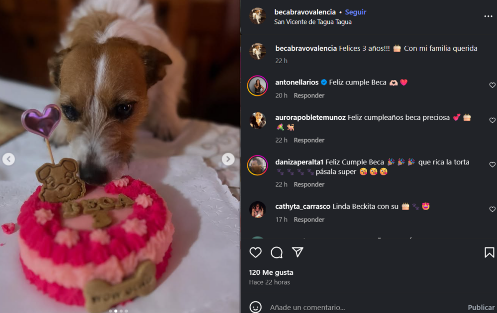En un post, detallaron que su mascota cumplió tres años este fin de semana, acontecimiento que celebraron en su residencia en San Vicente de Tagua Tagua.