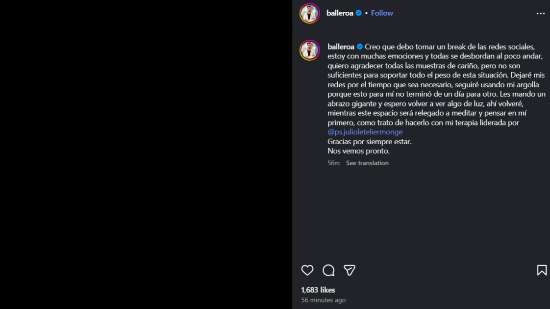 En un post en su Instagram, el ex chico reality le informó esta tarde a sus seguidores que dejará las redes sociales para poder sanar de mejor manera este delicado momento.