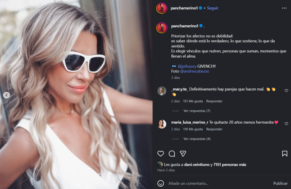 “Te sienta bien la soltería”, “Te quitaste 20 años”, “En tu mejor momento”; son algunos de los elogios que recibió Pancha Merino en su último post en Instagram.