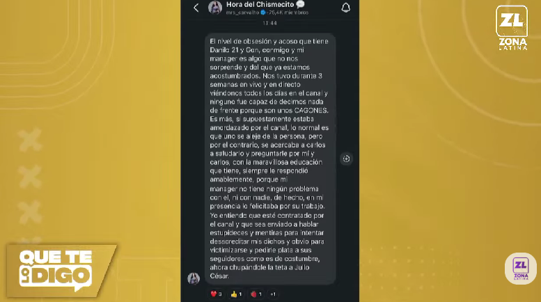 En su mensaje, Carvalho aseguró que “el nivel de obsesión y acoso que tiene Danilo 21 y Gon conmigo y mi manager, es algo que no nos sorprende y del que ya estamos acostumbrados”.