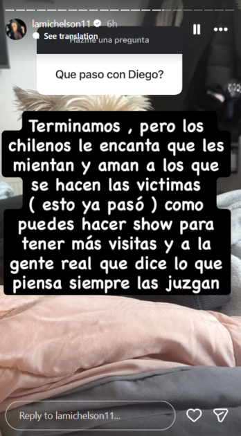 “Terminamos, pero a los chilenos les encanta que les mientan y aman a los que se hacen las víctimas (esto ya pasó)”, escribió en una de sus respuestas.