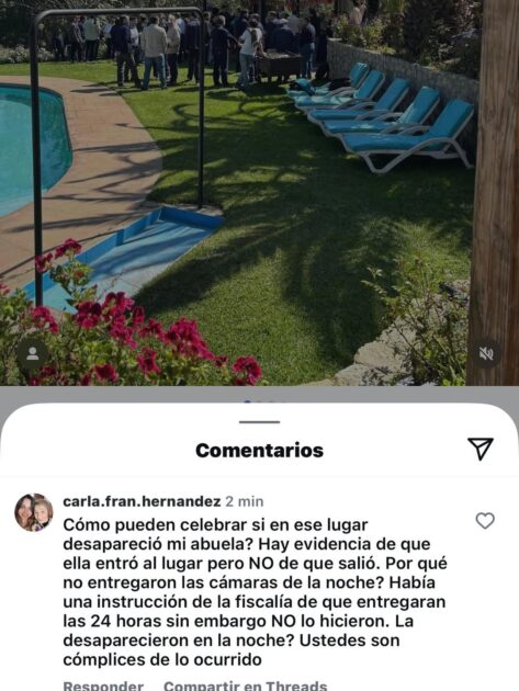 Carla comentó la publicación con duras palabras: “¿Cómo pueden celebrar si en ese lugar desapareció mi abuela? Hay evidencia de que ella entró al lugar, pero no de que salió”.