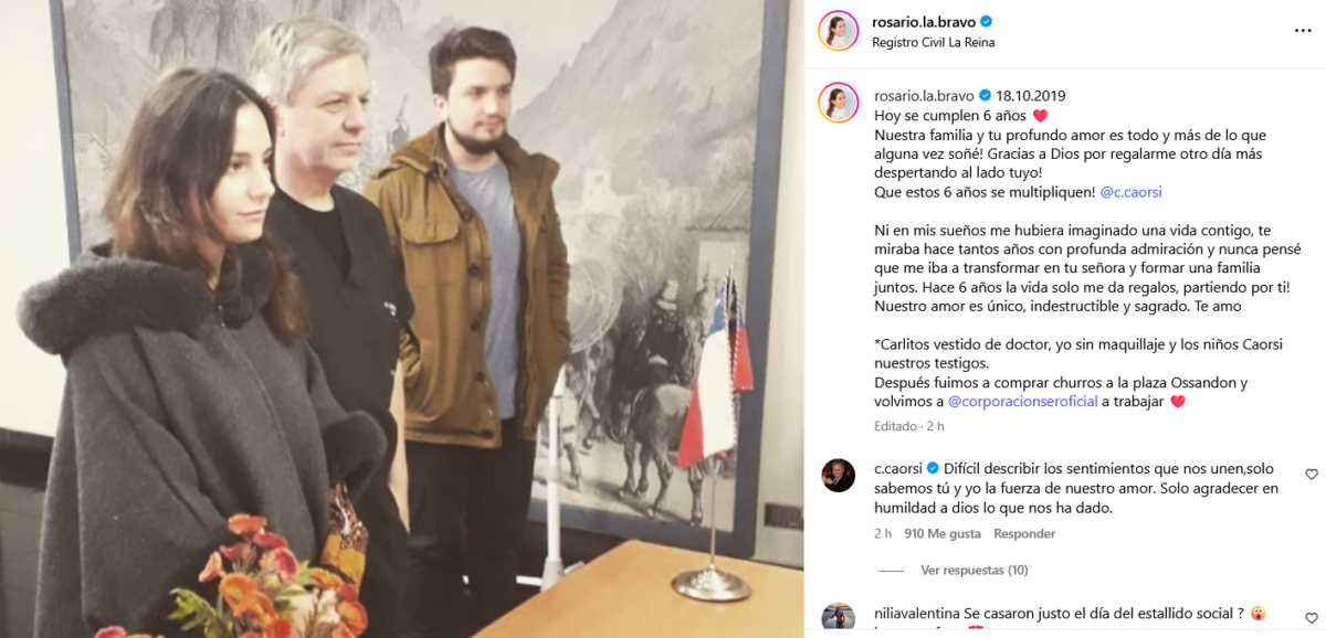Rosario Bravo y Carlos Caorsi cumplieron seis años de matrimonio, motivo por el que se expresaron en sus respectivas redes sociales.