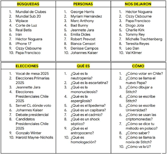 Y en un registro distinto —pero igual de significativo— las búsquedas relacionadas al fallecimiento de figuras como Héctor Noguera, que dejó una marca profunda en la escena cultural chilena, o de personalidades globales como Ozzy Osbourne y Papa Francisco, mostraron cómo ciertos acontecimientos movilizan a toda una comunidad en línea.