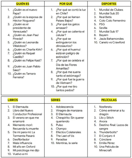 A partir de estas tendencias surgen, además, listados temáticos que agrupan búsquedas sobre personas, preguntas del tipo “cómo”, “qué es”, “por qué”.
