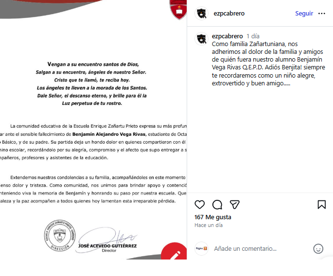 “Como familia Zañartuniana, nos adherimos al dolor de la familia y amigos de quien fuera nuestro alumno Benjamín Vega Rivas Q.E.P.D. ¡Adiós Benjita! Siempre te recordaremos como un niño alegre, extrovertido y buen amigo”, señalaron.
