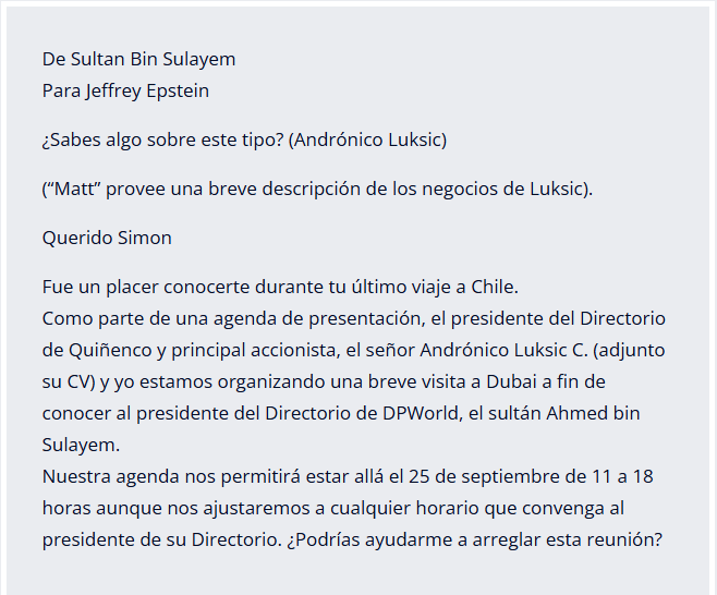Sobre el caso de Luksic, es mencionado en una comunicación sostenida entre el fallecido magnate financiero y el empresario emiratí Sultan Bin Sulayem.