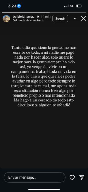 Finalmente, Balbi El Chamako aseguró que “no pienso bajar los brazos en todo caso. Gracias por todos sus mensajes de apoyo que me están llegando”.