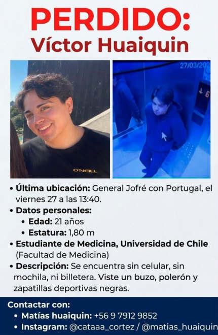 Una intensa búsqueda mantiene en alerta a la familia de Víctor Huaiquin, joven de 21 años que se encuentra desaparecido desde el viernes 27 de marzo, luego de salir del departamento donde reside en Santiago Centro.