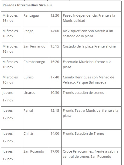 El trayecto al sur del país desde Santiago a Temuco se realizará en tren lo que permitirá saludar a más personas, realizando doce paradas intermedias, pasando por: Rancagua, Rengo, San Fernando, Chimbarongo, Curicó, Linares, Parral, Chillán, San Rosendo, Renaico, Collipulli y Victoria.