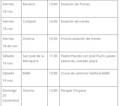 Y finalmente el trayecto para ir cerrando la caravana de la solidaridad, se realizará en bus hasta llegar a Puerto Montt. Con tres últimas paradas intermedias por San José de la Mariquina, Máfil y Osorno.