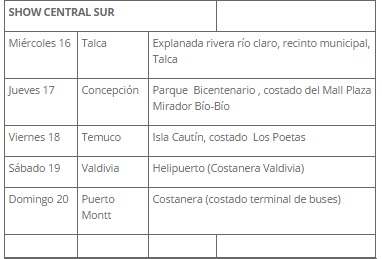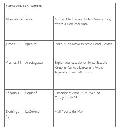 Serán diez escenarios centrales, donde se realizarán shows de más de dos horas con los mejores artistas para disfrutar bailando en familia. La ruta considera Arica, Iquique, Antofagasta, Copiapó, La Serena, Talca, Concepción, Temuco, Valdivia y Puerto Montt.