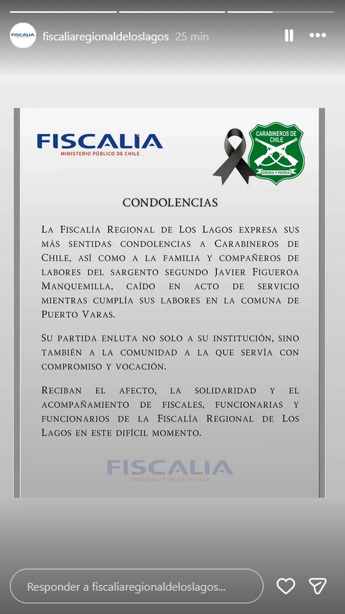 El organismo expresó sus condolencias “a Carabineros de Chile, así como a la familia y compañeros de labores del sargento segundo Javier Figueroa Manquemilla, caído en acto de servicio mientras cumplía labores en la comuna de Puerto Varas”.