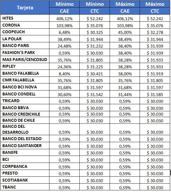 A continuación puedes ver el listado completo de cuánto cuesta adquirir con cada tarjeta de crédito un producto de $30.000, en 3 cuotas con el mínimo y máximo CAE. Cabe añadir que, como ya indicamos, el CTC es el costo total a cancelar por el cliente: