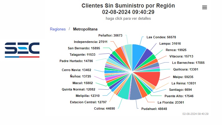 De acuerdo a los datos entregados por la Superintendencia de Electricidad y Combustibles (SEC), la comuna de Maipú es la más afectada, con 59. 235 clientes sin luz.