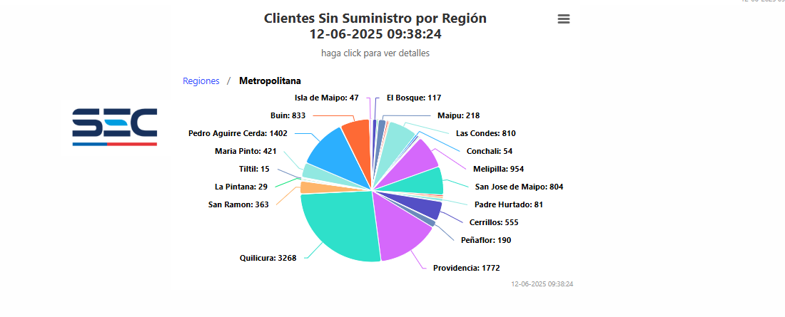En tercer lugar está la región Metropolitana, con más de 12 mil clientes afectados. En ese contexto, Quilicura tiene más de tres mil personas sin luz, le siguen Pedro Aguirre Cerda con 1.402 y Providencia con 1.772.