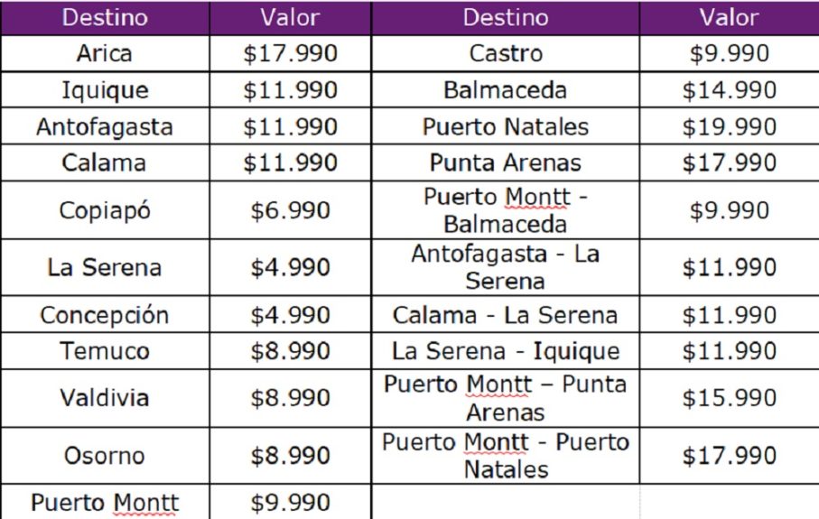 En rutas nacionales destacan La Serena, Chiloé, Concepción y Puerto Natales, con precios especiales de $4.990, $9.990, $4.990 y $19.990, respectivamente. Todos valores son por tramo desde Santiago y sin considerar tasas de embarque.