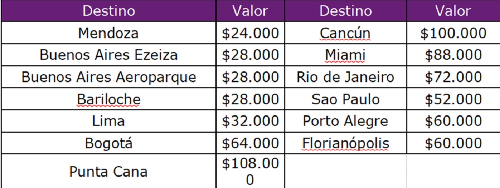 Entre los destinos más atractivos internacionales están Sao Paulo, Cancún, Buenos Aires, Miami, Bariloche y Florianópolis, que llegan con precios desde los $52.000, $100.000, $28.000, $88.000, $28.000, $60.000, respectivamente.