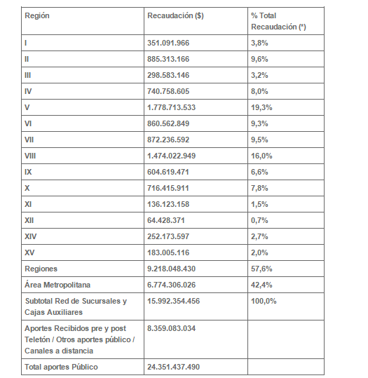 En cuanto a los donantes por Regiones, la Metropolitana aportó un 42,4% del total recaudado; mientras que el resto de las regiones un 57,6%.