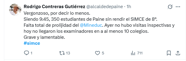Misma opinión expresó el alcalde de Paine, Rodrigo Contreras, quien en X indicó que fue “una falta total de prolijidad del Mineduc. Ayer no hubo visitas inspectivas y hoy no llegaron los examinadores a al menos 10 colegios. Grave y lamentable”.