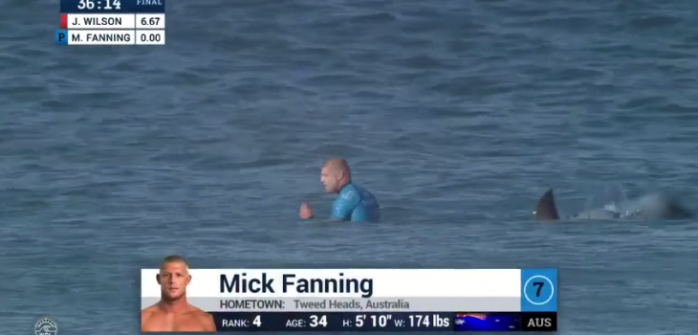 Fanning, de 34 años, estaba sentado en su tabla esperando las olas cuando notó un impacto. Inmediatamente se gira, ve la aleta del tiburón y comienza a remar, consiguiendo escapar del ataque. Momentos después es remolcado por una moto acuática de la organización.