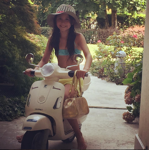 Lo llamativo de la Vespa que luce la retoña del artillero es que se trata de una versión más pequeña e ideal para su tamaño.