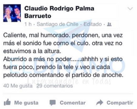 Los problemas técnicos que opacaron la transmisión del duelo molestaron en demasía a Palma, que sin pelos en la lengua criticó abiertamente a su casa televisiva mediante un duro mensaje publicado en su cuenta de Facebook.
