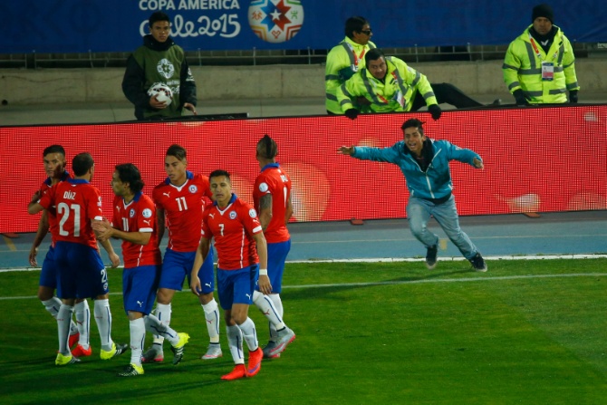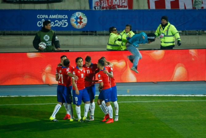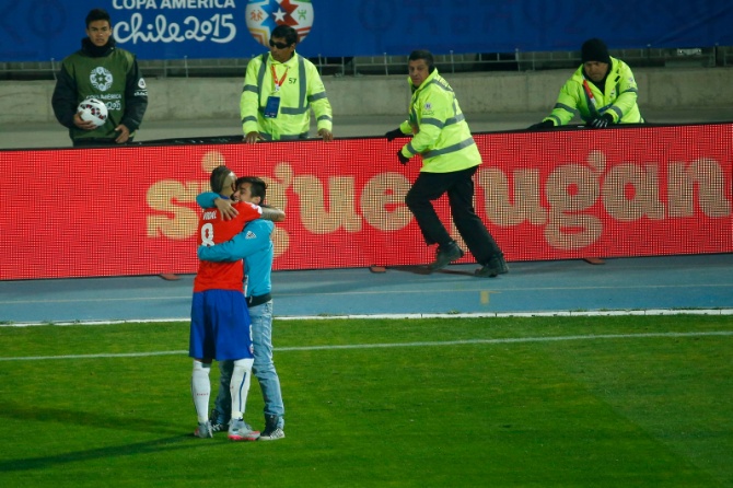 Precisamente fue durante el festejo del gol conseguido desde el punto de sentencia, cuando un hincha burló el perímetro de seguridad e ingresó al terreno de juego como un jugador más a celebrar con Arturo.