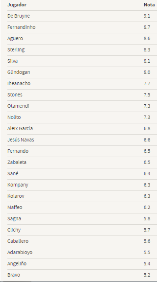 Valoración de los jugadores del Manchester City