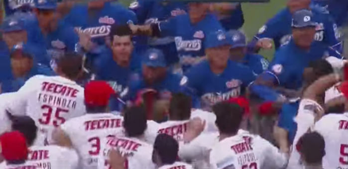 En una multitudinaria pelea terminó un encuentro disputado por la Liga Mexicana del Pacífico de béisbol entre los Charros de Jalisco y las Águilas de Mexicali debido a una jugada de riesgo.
