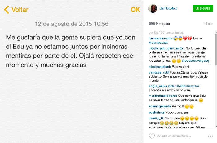 “Me gustaría que la gente supiera que yo con el Edu ya no estamos juntos por incineras mentiras por parte de él. Ojalá respeten ese momento y muchas gracias”, fue la feroz acusación de Daniela en redes y que a los pocos minutos borró, pero ya era tarde, puesto que la captura quedó inmortalizada de acuerdo a lo mostrado por diario La Cuarta.