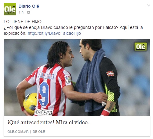 Lo tiene de hijo, señalaron los argentinos en sus redes sociales, mientras que en su sitio web titularon: “El Terror de Bravo”, añadiendo “. “Falcao le convirtió seis goles en seis partidos al arquero de Chile: tres en la selección Colombia y otros tres en el Atlético Madrid”.