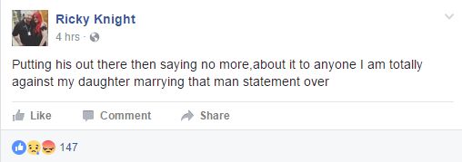 “Sacaré esto y luego no le diré nada a nadie más. Estoy totalmente en contra de que mi hija se case con ese hombre. Fin del comunicado”, escribió el exluchador británico Ricky Knight en su Facebook, sobre la relación de su pequeña, según consignó Record.
