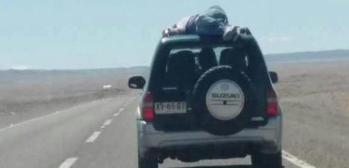 Difunden el peligroso viaje de un joven amarrado al techo de un auto en Calama