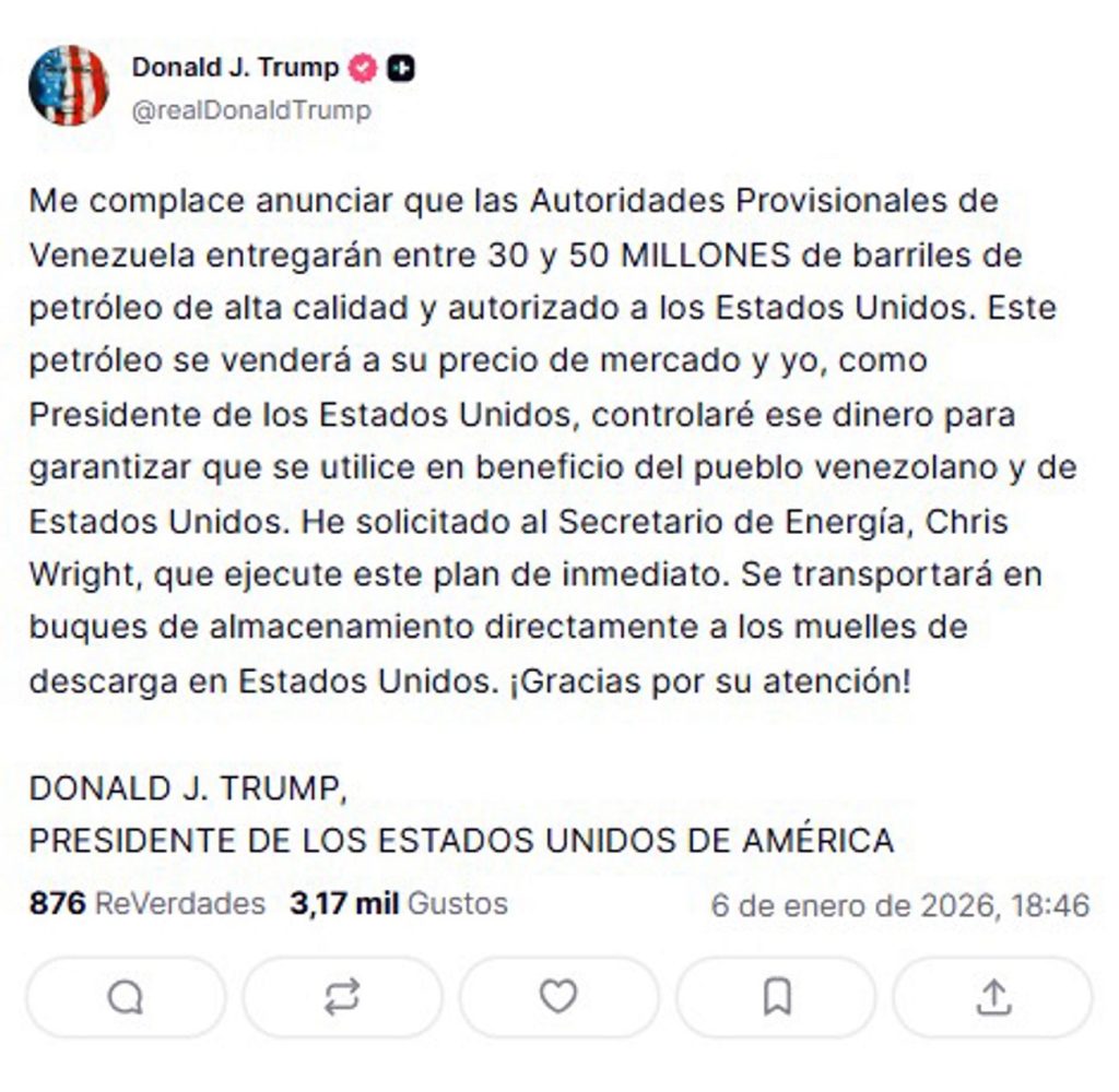 El presidente de EE.UU., Donald Trump, aseguró este martes que el gobierno de Venezuela, ahora dirigido por la presidenta encargada, Delcy Rodríguez, está dispuesto a entregarles de 30 a 50 millones de barriles de petróleo que serán vendidos en el mercado estadounidense.