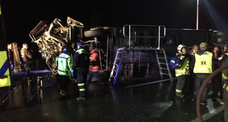 De acuerdo a información policial, en el lugar un bus de la empresa Línea Azul -que inició su viaje desde Santiago hacia Los Ángeles y Temuco- se volcó en una curva por razones que aún se desconocen.