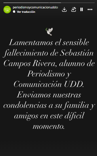 “Lamentamos el sensible fallecimiento de Sebastián Campos Rivera, alumno de Periodismo y Comunicación UDD. Enviamos nuestras condolencias a su familia y amigos en este difícil momento”, expresaron desde la casa de estudios, a través de sus redes sociales.