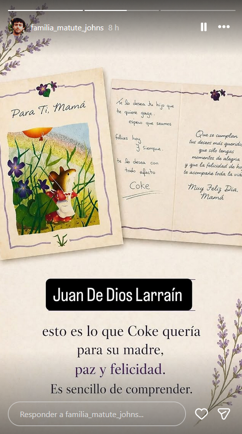 La respuesta de la familia Matute Johns no se hizo esperar. A través de redes sociales, publicaron una carta que ‘Coke’ le escribió a María Teresa para el Día de la Madre.