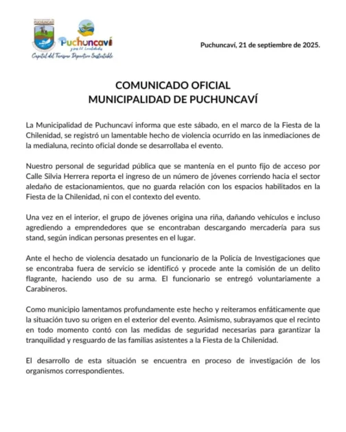 La municipalidad aclaró que “nuestro personal de seguridad pública que se mantenía en el punto fijo de acceso por Calle Silvia Herrera reporta el ingreso de un número de jóvenes corriendo hacia el sector aledaño de estacionamientos, que no guarda relación con los espacios habilitados en la Fiesta de la Chilenidad, ni con el contexto del evento”.